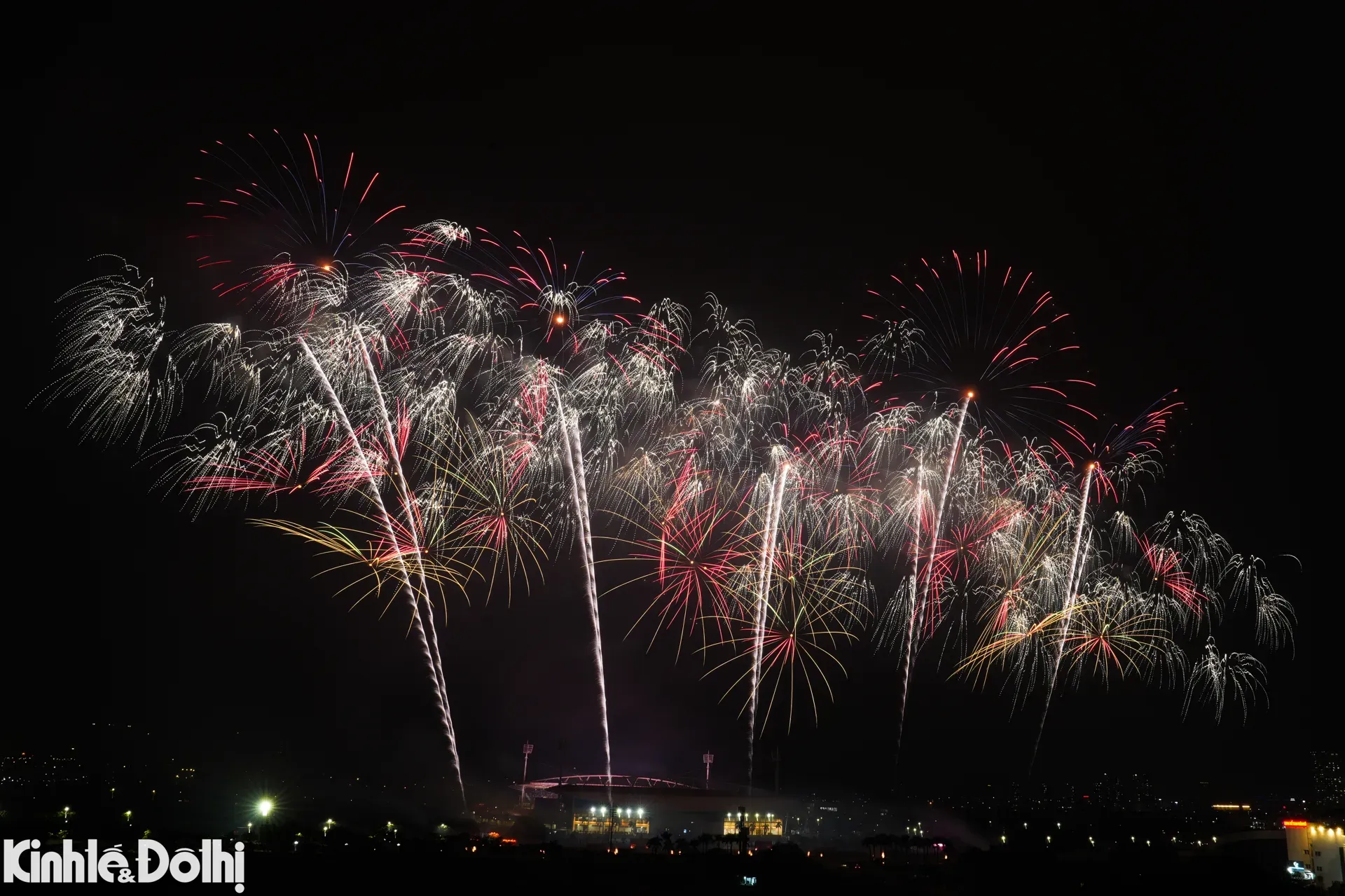 High-altitude fireworks line Le Duc Tho Street, extending the celebration beyond the stadium.