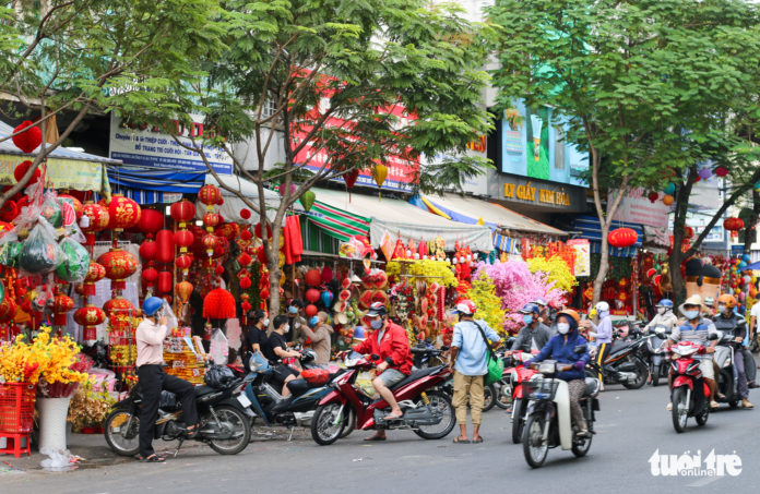| People shop for Lunar New Year decorations at ‘Tai Loc’ Market on Hai Thuong Lan Ong Street in District 5, Ho Chi Minh City. Photo: Chau Tuan / Tuoi Tre |