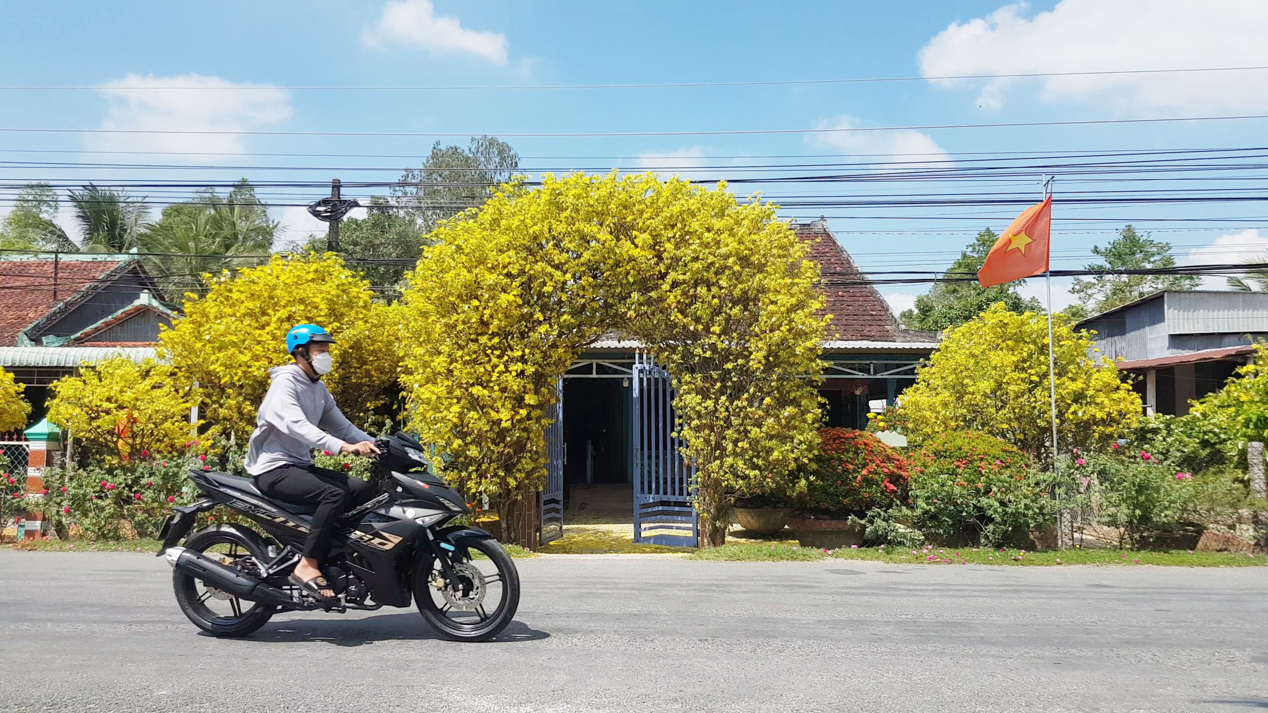 | An aerial photo of Vo Van Banh’s four-meter-high gate grown from two yellow apricot blossom trees in An Giang Province, Vietnam, February 3, 2022. Photo: Ngoc Khai / Tuoi Tre |