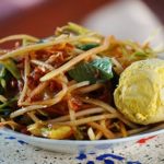The dish in Laos is known as tam maak hung, and though it is similar to Thailand’s version, there are a few things that differ. Instead of using fish sauce, for instance, Laos vendors add in a fermented fish paste, which is much more overpowering and oftentimes not well liked by visitors who have yet to acquire a Laos palate. Green eggplants are also added to papaya salad in Laos, and it is generally not as sweet as Thailand’s version, though they are equally as spicy. While some Thai restaurants offer papaya salad, it is popularly known as a street food.
