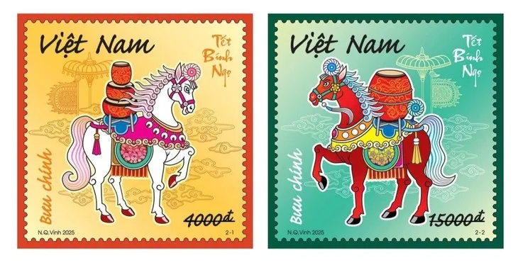 Modern reinterpretations of classic Vietnamese horse motifs on Tet stamps.